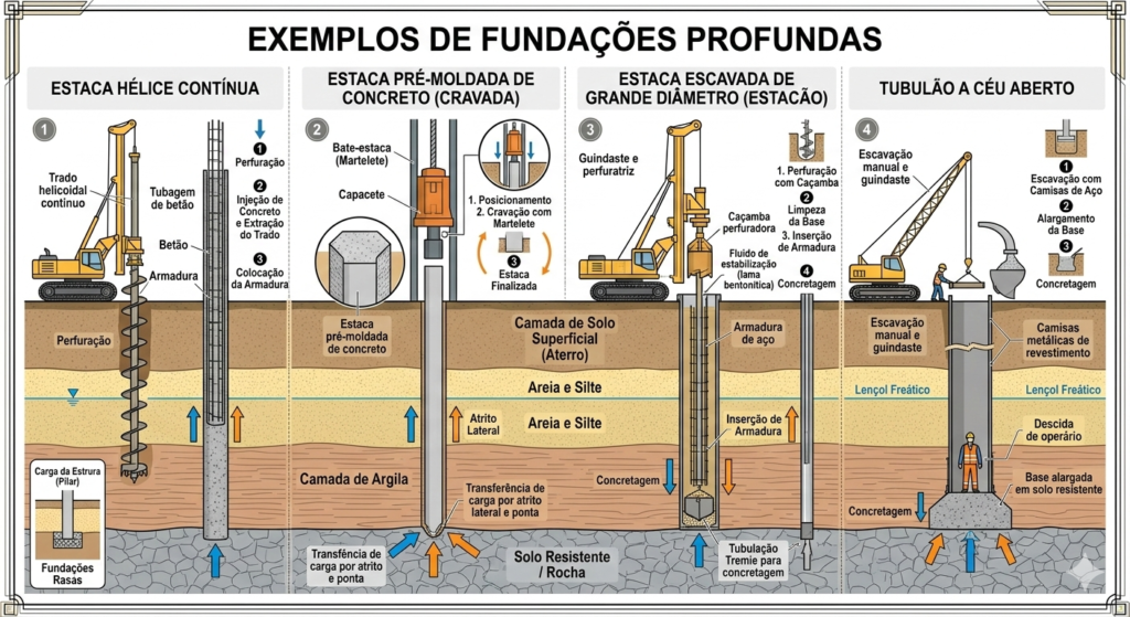 – Tubulões: Fundações cilíndricas que permitem a descida de operários na fase final para limpeza ou alargamento da base. Podem ser escavados a céu aberto ou com revestimento de camisa metálica ou de concreto.